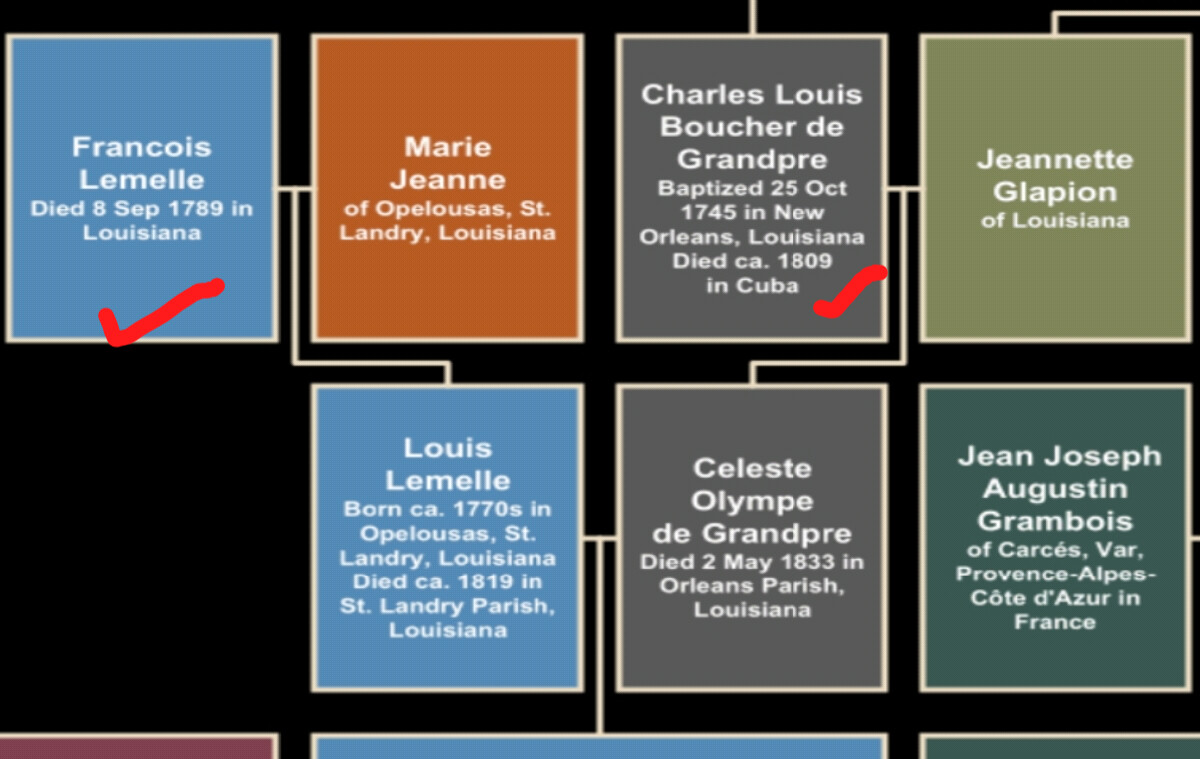 Su tatarabuelo, Carlos Louis Boucher de GrandPré (1745–1809), fue nombrado comandante del puesto militar de Pointe Coupée durante el periodo de dominio español, ejerciendo entre 1776 y 1781. No se trataba de un cargo menor: Pointe Coupée era un enclave estratégico en el control del río Misisipi y en la defensa del flanco occidental frente a los británicos.